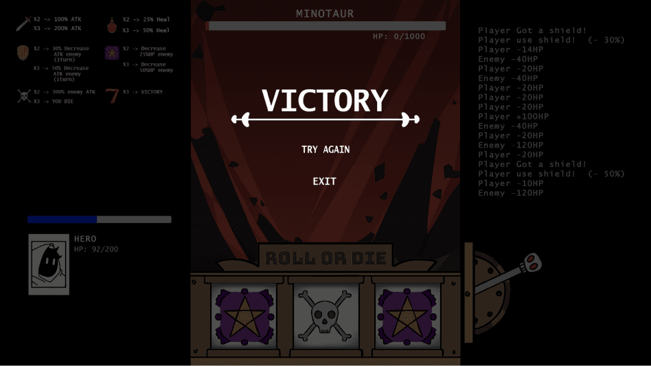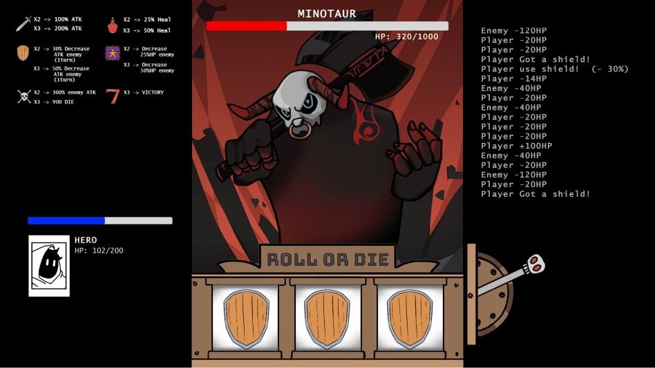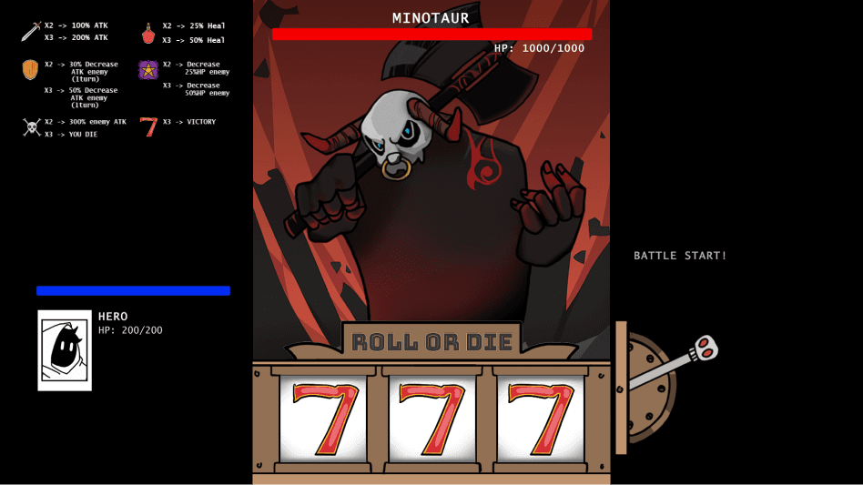 Roll or Die is a point-and-click game that brings random-generate numbers. It tells the story of a knight who is sent somewhere to fight a Minotaur. Features a slot machine mechanic as the main mechanic to defeat the Minotaur. Players need to roll the slot machine to win over the Minotaur.